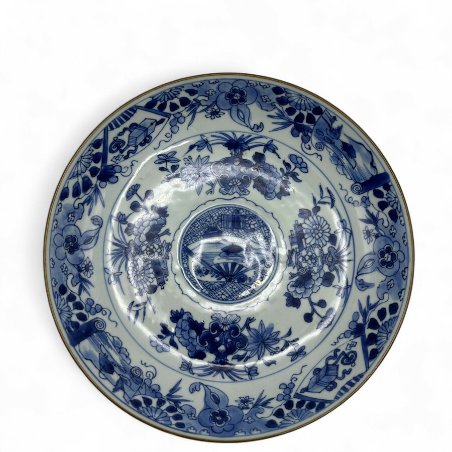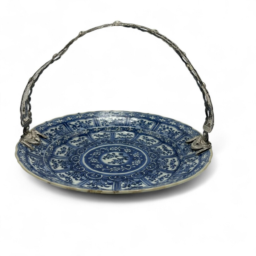 Een antieke vroeg 18e eeuwse Chinees porseleinen schaal, Kangxi periode (1661-1722), met onderglazuur blauw decor van bloemen in medaillons. Met 19e eeuwse tweede gehalte (835/1000) zilveren beu...