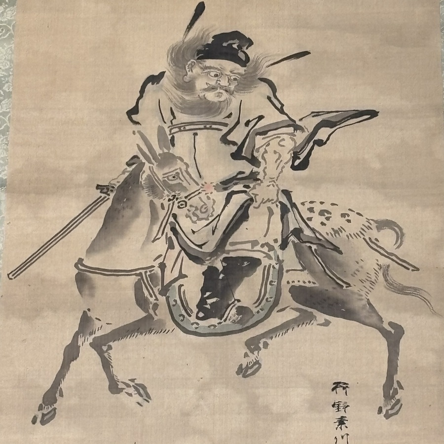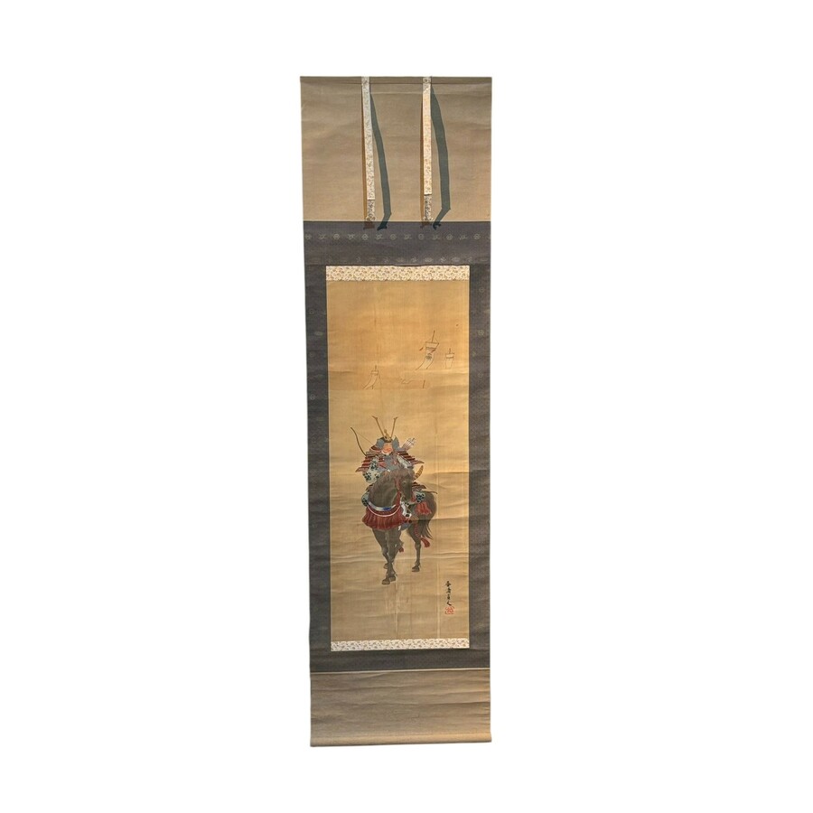Aziatische scroll met voorstelling van een samoerai te paard, met in de verte enkele vaandels zichtbaar, gouache op zijde, rechtsonder gesigneerd, 20e eeuw