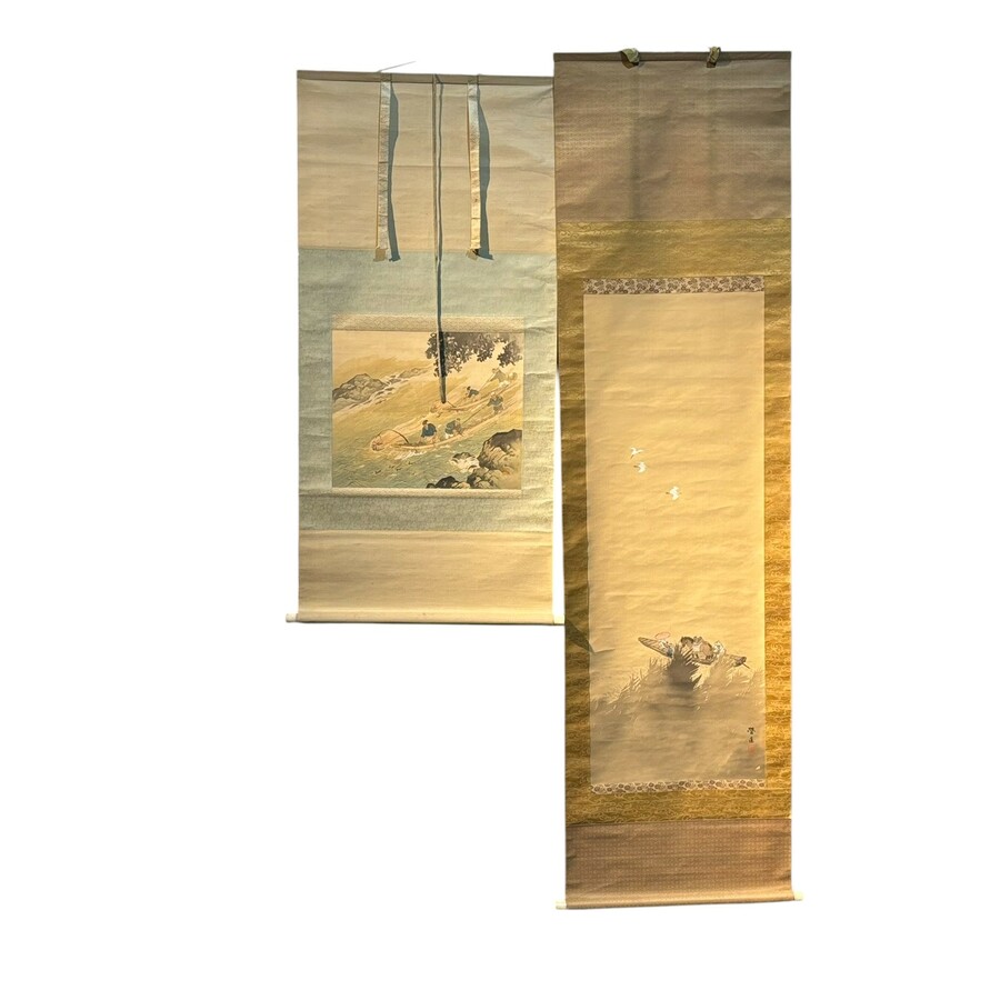 Twee Aziatische scrolls: vissers aan het werk, en figuren met paard op een bootje, beide gewassen Oost-Indische inkt en gouache op papier, met signaturen, 20e eeuw