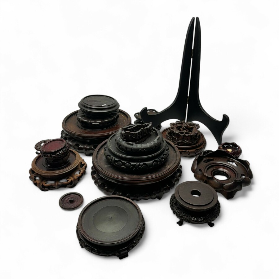 Lot Chinese gestoken houten basementen, daarbij: één grote bordenstandaard