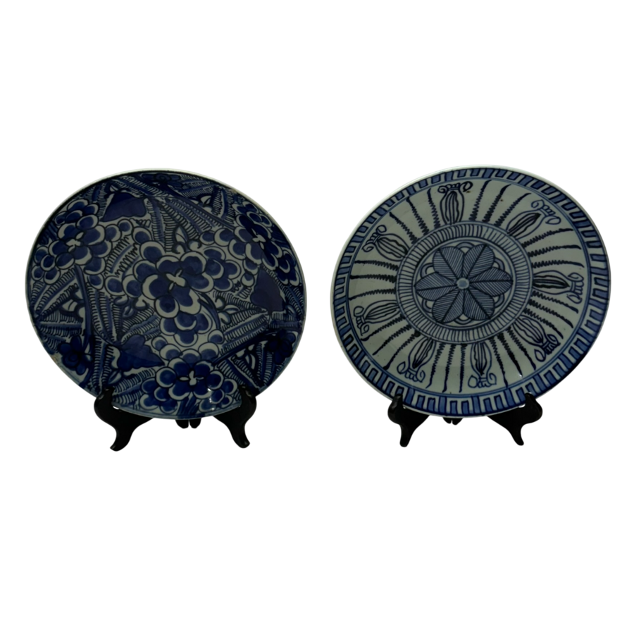 Lot van twee antieke 19e eeuwse Chinees porseleinen schotels, onderglazuur blauw-wit gedecoreerd. Beide gemerkt met 'shop mark'.