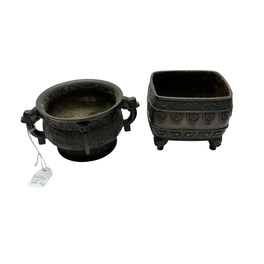 Lot van twee Chinese bronzen wierrookbranders, één rond model met twee oren en één vierkant model, op vier pootjes.
