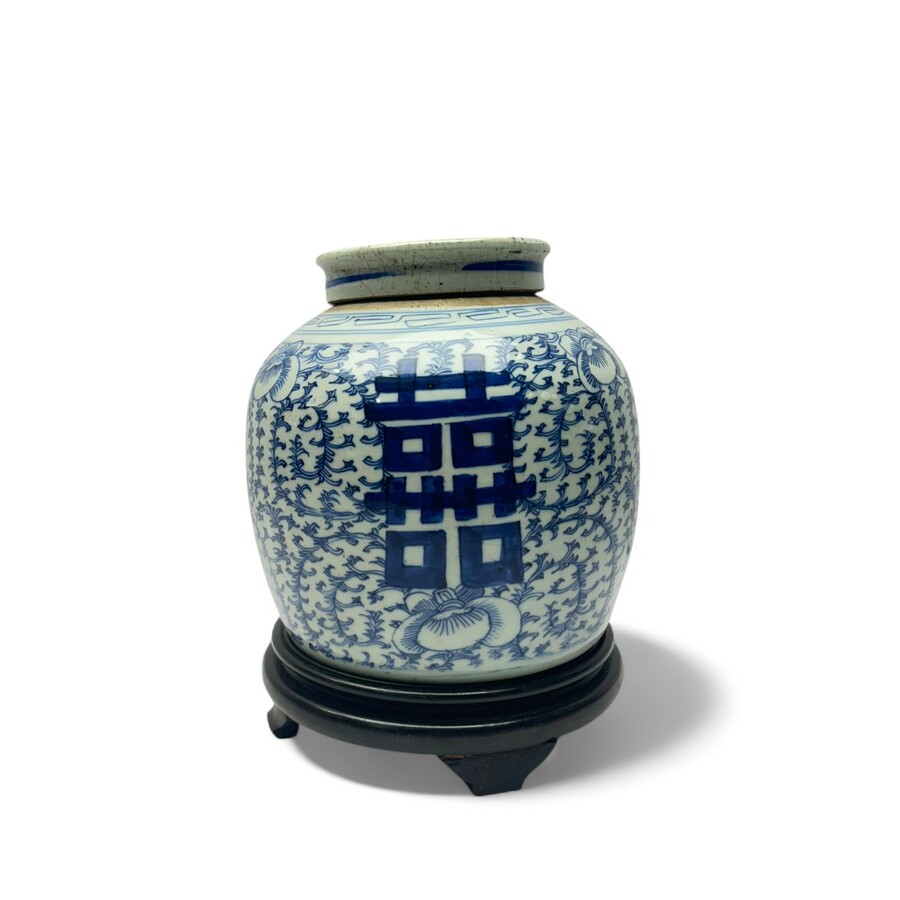 Een antieke 19e eeuwse Chinees porseleinen gemberpot, met onderglazuur blauw-wit decor van bloemen en gemerkt met ‘Longevity’ symbool.