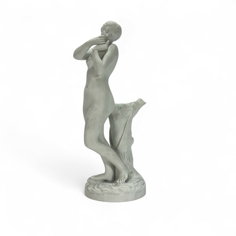 Een 19e of vroeg 20e eeuws biscuitporseleinen sculptuur, vrouw met vogel. Aan de onderzijde gesigneerd 'D.P.'
