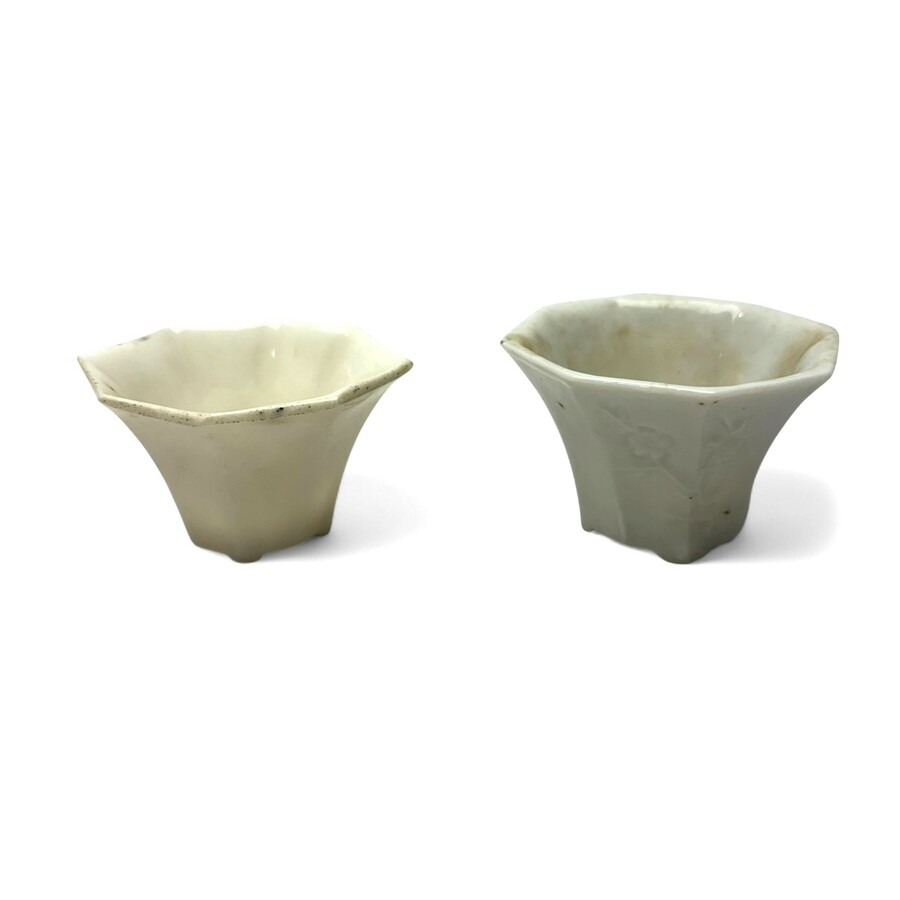 Lot van twee Chinees porseleinen Blanc de Chine achtkantige kopjes. Eén met relïefvoorstelling van bloemen aan een tak, één met enkele karaktertekens, tevens aan de onderzijde gemerkt met zegelm...