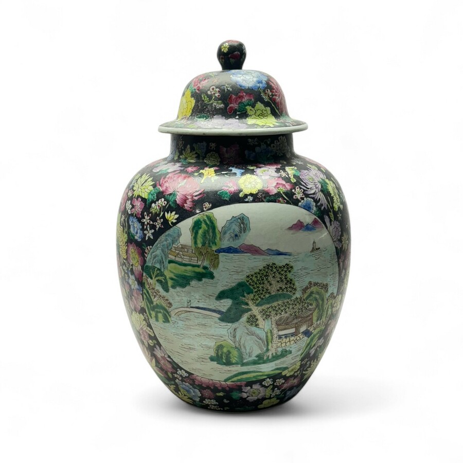 Een 20e eeuwse Chinees porseleinen dekselpot, Famille Noire, decor met aan de voor- en achterzijde twee grote medaillons met landschapsdecors, omringd door florale motieven. Aan de onderzijde ge...