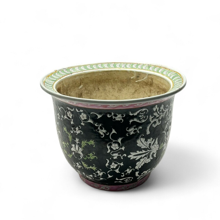 Een 20e eeuwse Chinees porseleinen cachepot, Famille Noire, beschilderd met florale motieven.