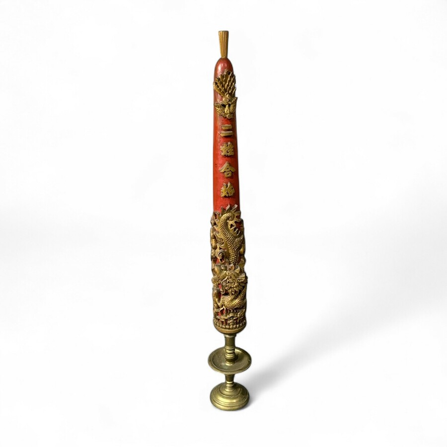 Een 20e eeuwse Chinese uit hout gestoken pilaar, met onder andere decor van draak en karaktertekens, beschilderd in goud en rood. Gemonteerd op bronzen schijfkandelaar.