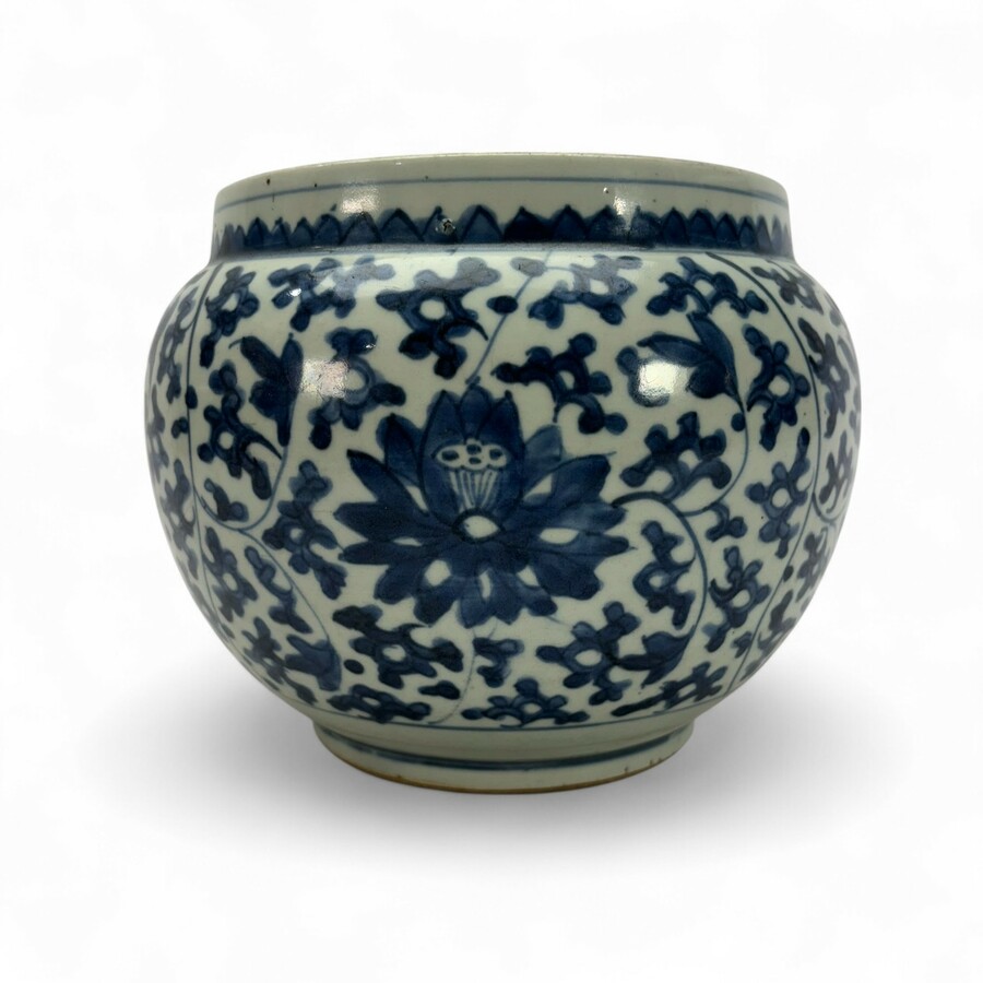 Een antieke Chinees porseleinen bloempot met onderglazuur blauw-wit floraal decor, mogelijk Ming, Wanli periode.