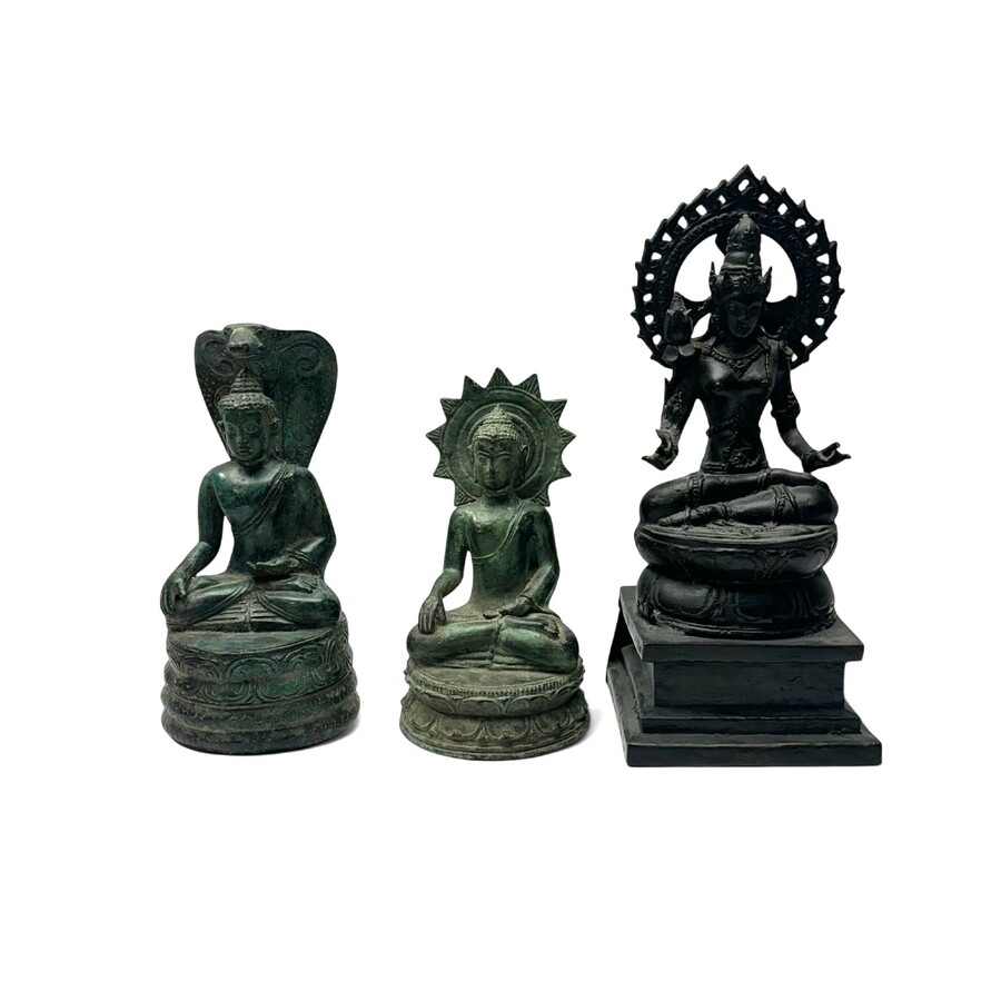 Drie gepatineerd bronzen en messing zittende Boeddha's op lotus bladeren. Op open voeten, waarvan 1 op vierkante voet. tweede heft 20e eeuws.