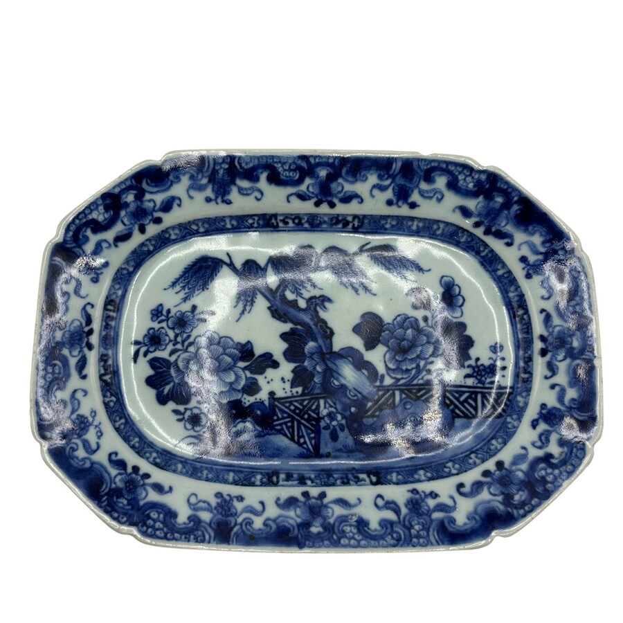 Chinees Qianlong periode porseleinen onderschotel of serveerschaal. Blauw/wit met een decor van een Oosterse tuin met hekwerk, rots en pioenroos.