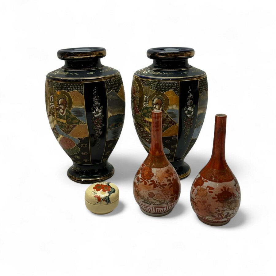 Vier Japans porseleinen en Satsuma vazen. Twee pijpvazen met decor van vogels in het rood. Hierbij twee vergulde vazen met Oosterse figuren op blauwe ondergrond. En een zalfpotje met prunisbloes...