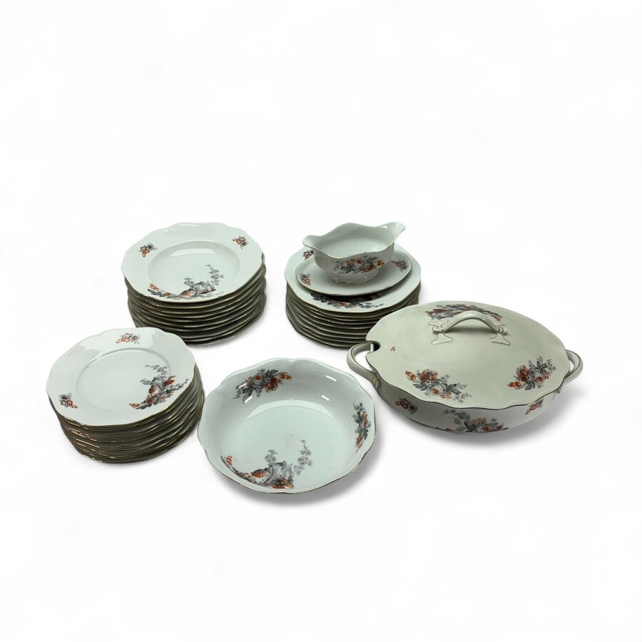 Lot 20e eeuwse porseleinen serviesdelen: terrine, schaal, sauskom en borden in diverse formaten. Allen gemerkt KPM, Duitsland.