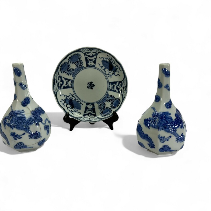 Lot Japans porselein: twee 19e eeuwse vazen, zeskantig model met drakendecor. Eén gelijmd. Met daarbij een 18e eeuwse schotel, gemerkt met zeskaraktermerk.
