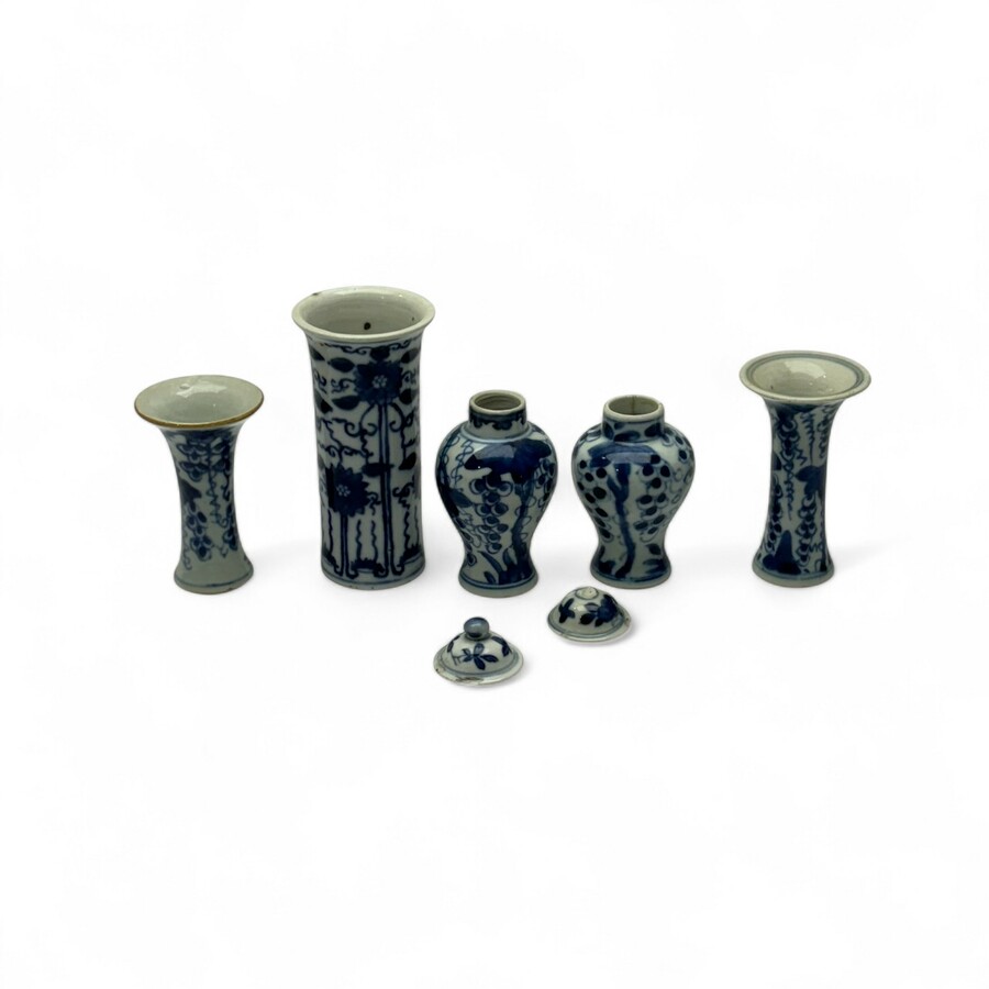 Vijf 18e en 19e eeuwse Chinees porsleinen miniatuur kaststel delen. Bestaand uit twee dekselvazen, twee bekervazen en een los 19e eeuwse vaasje.