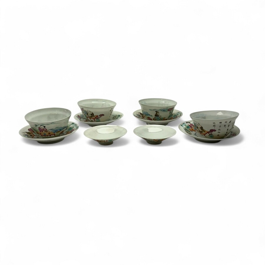 Vier 19e eeuwse Japans eierschaal porseleinen rijskommen op onderschotels en met twee deksels. Met een polychroom decor van Oosterse figuren en kostbaarheden.