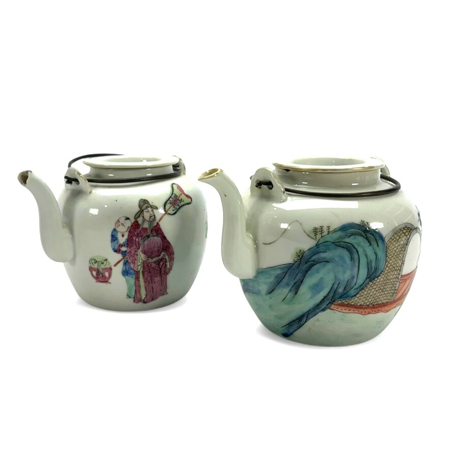 Lot van twee antieke 19e eeuwse Chinees porseleinen theepotjes met metalen grepen. Rondom beschilderd met figuren, aan de onderzijde gemerkt met zegelmerk.