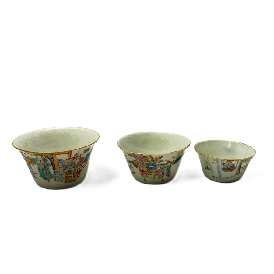 Lot van drie 19e eeuwse Chinees porseleinen kommen, gedecoreerd met figuren. Aan de onderzijde gemerkt met zegelmerk.