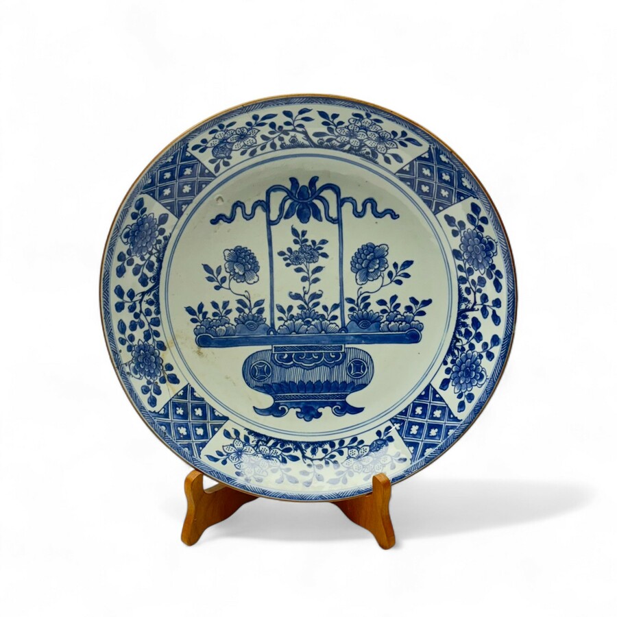 Een antieke 18e eeuwse Chinees porseleinen schotel, Qianlong periode (1735-1796), met onderglazuur blauw-wit decor van bloemenmand, de randen met geometrische en florale motieven.