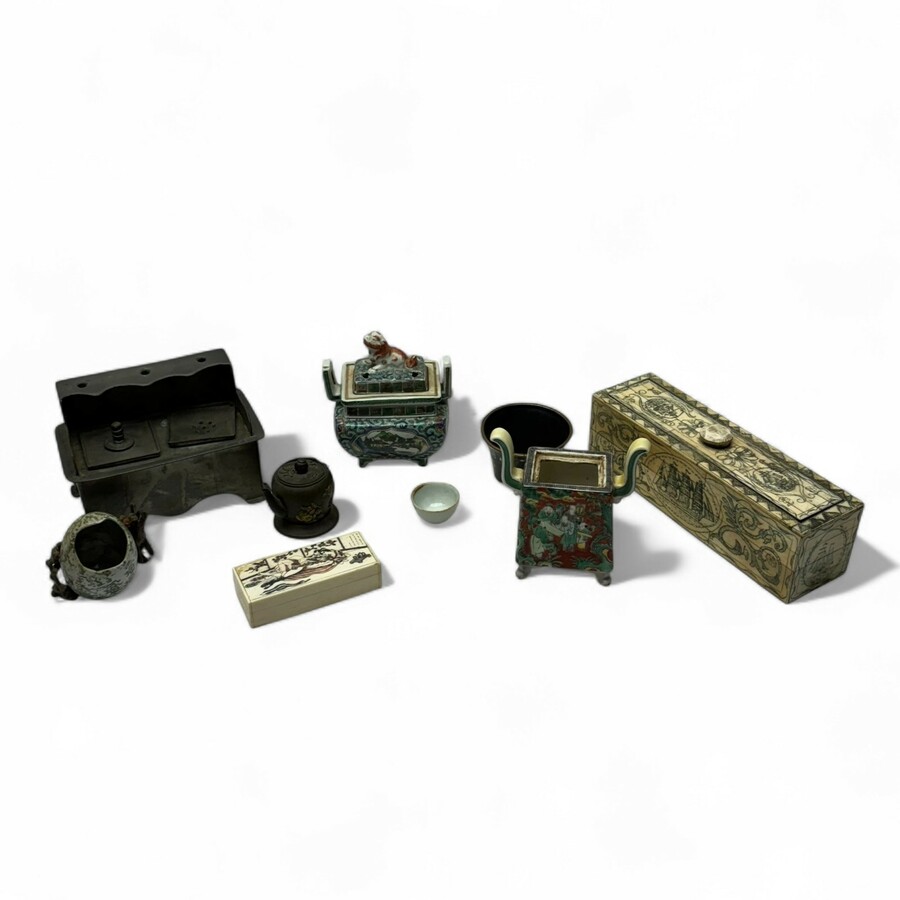 Lot divers, waaronder een 20e eeuws benen doosje met decor van schepen, een tinnen inktstel, twee Japanse wierookbranders (waarven één met deksel), Japans benen doosje met erotische voorstelling...
