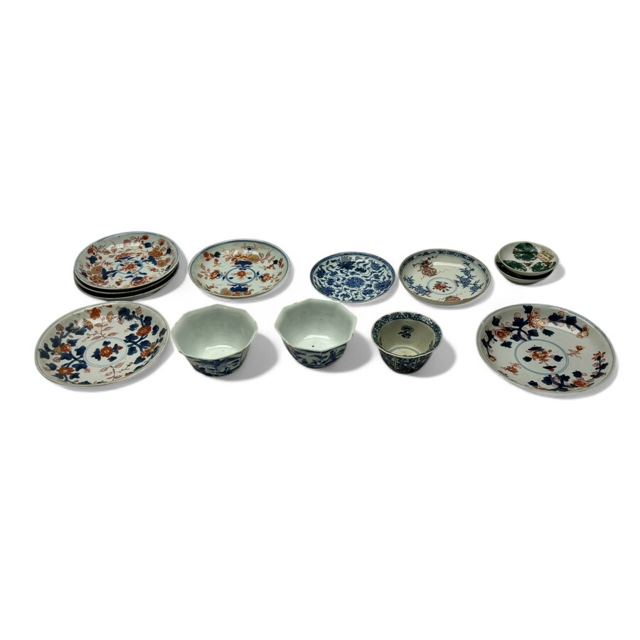 Lot met dertien stuks 18e eeuws Qianlong en Kangxi Chinees porselein. Bestaande uit tien schotelstjes in Imari, blauw/wit en Amsterdams bont. Hierbij drie blauw/wit kopjes, waarvan twee achtkant...