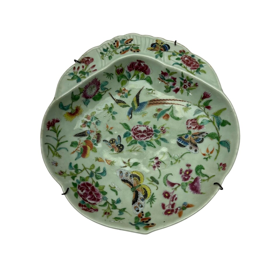 Een antiek 19e eeuws Chinees porseleinen garnalenbord. Kantonees, celadon kleur met emaillebeschildering van bloemen en vogels.