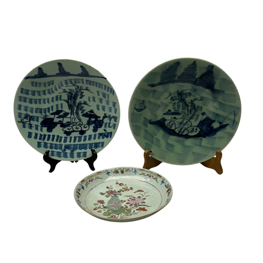 Lot van drie 19e eeuwse Chinees porseleinen borden: één 19e eeuws bord, Famille Rose, met bovenglazuur emaillebeschildering van bloemen in en bij een vaas. Met daarbij twee 19e eeuwse onderglazu...