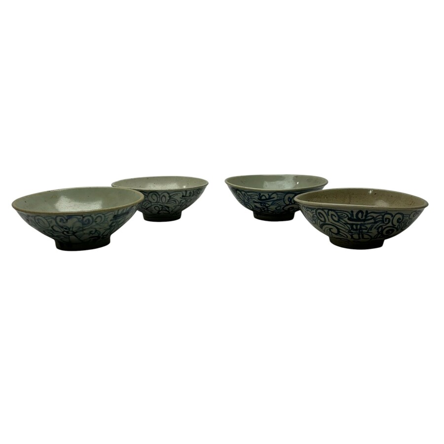 Lot van vier antieke Chinees porseleinen kommen met onderglazuur blauw-wit decor. Boerenming, 19e eeuws.