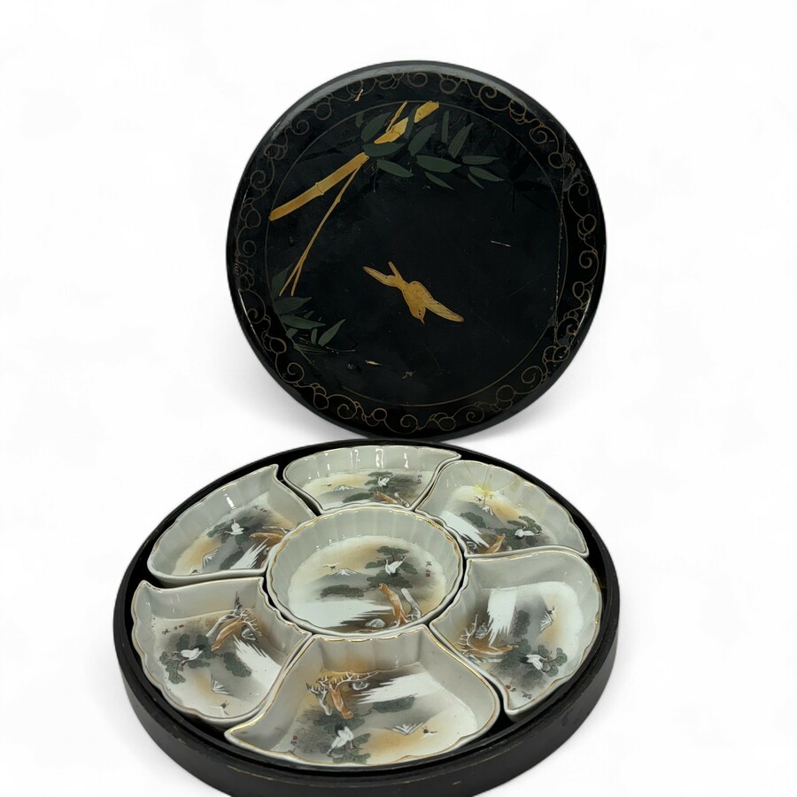 Een Japans lakwerk op houten ronde doos, 32 cm doorsnede. Met hierin een zevendelige sweetmeat set. Hierbij nog twee Japans lakwerken voorwerpen. Een ronde dekseldoos en een dienblad met koi kar...
