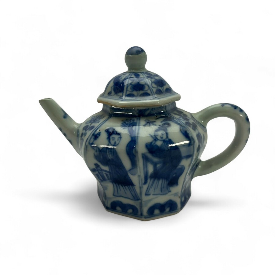 Een antiek Chinees porseleinen trekpotje uit de Kangxi periode. Achtkantig model. Blauw/wit met een lijzen en peterselie decor.