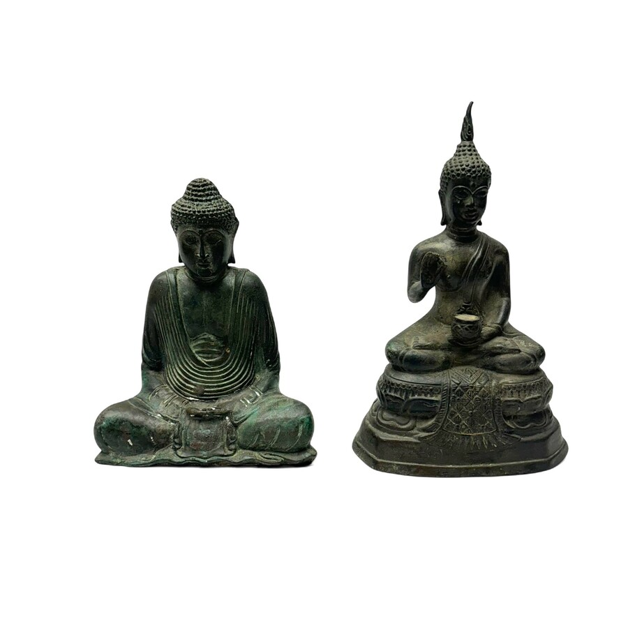 Twee gepatineerd bronzen en messing Boeddha's. tweede helft van 20e eeuws.