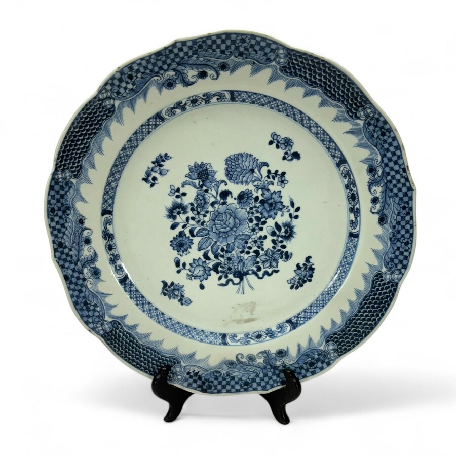 Een grote 18e eeuwse onderglazuur blauw-wit gedecoreerde schotel, Qianlong periode (1735-1796)