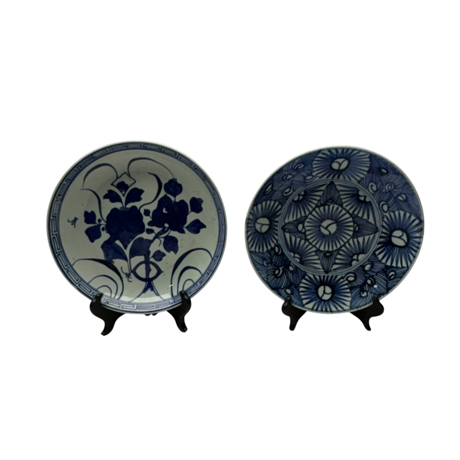 Lot van twee antieke 19e eeuwse Chinees porseleinen schotels, onderglazuur blauw-wit gedecoreerd. Gemaakt voor de Indonesische markt.