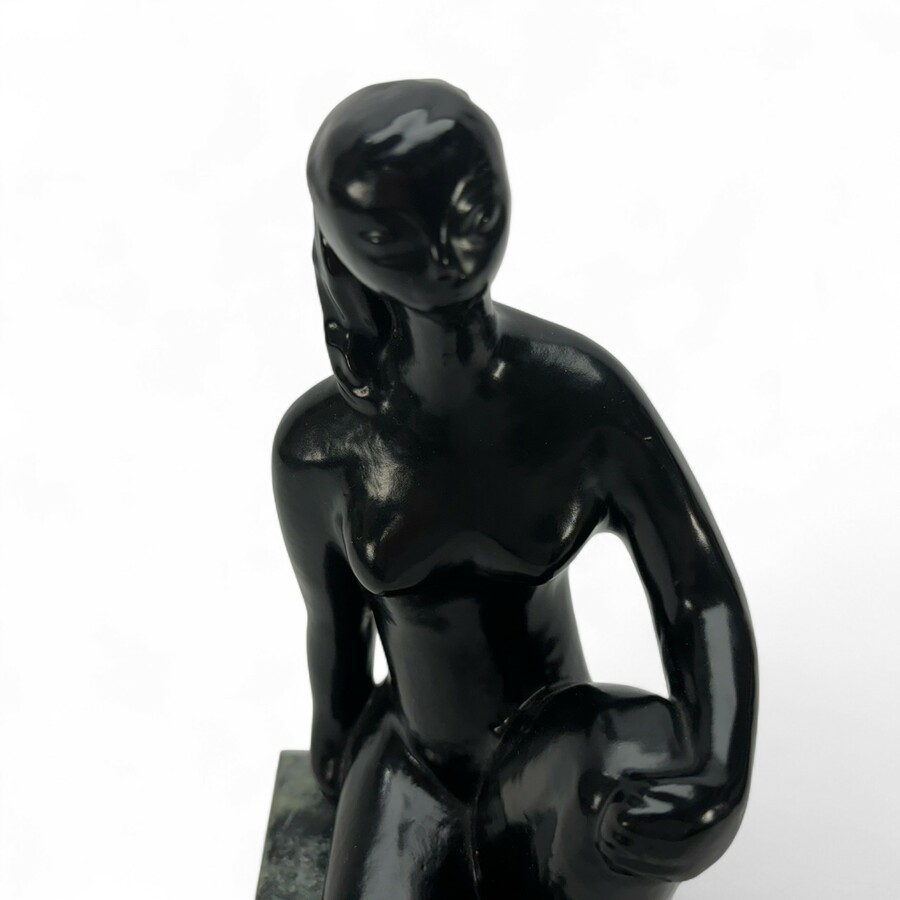 Een Frans gepatineerd modern bronzen sculptuur van een naakt op een marmeren
