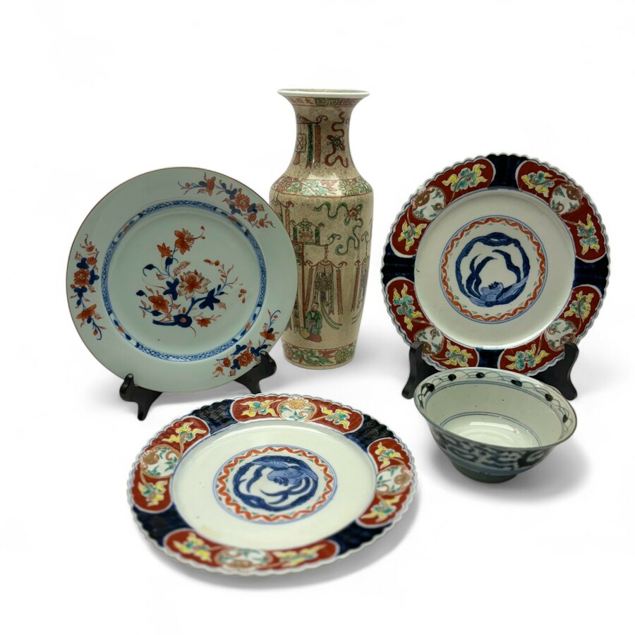 Lot van vijf stuks Chinees en Japans porselein: twee 19e eeuwse Japans imari schotels, een 19e eeuwse Chinese Famille verte vaas, een 18e eeuws Chinees imari bord, Qianlong periode (1735-1796) e...