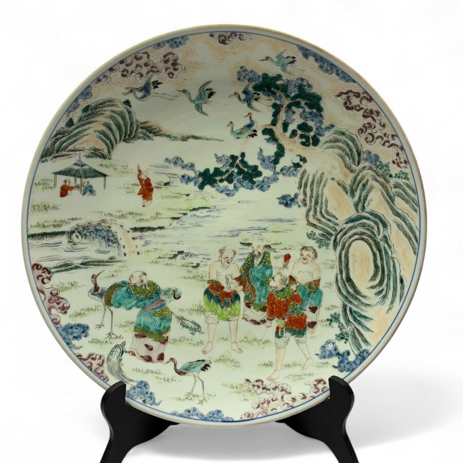 Een antieke 19e eeuwse Japans porseleinen schotel met decor van diverse figuren en dieren in een landschap. Aan de achterzijde gemerkt met zeskaraktermerk.