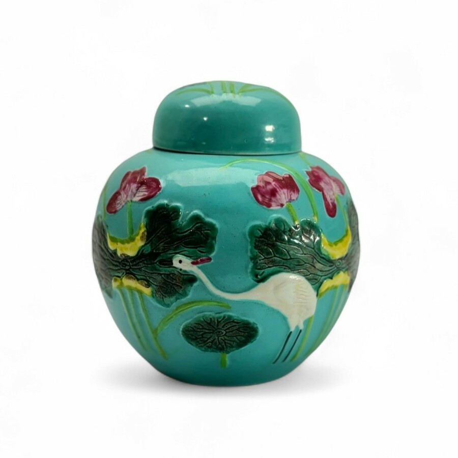 Een 20e eeuwse Chinese gemberpot, turqoise, met decor van kraanvogels tussen bladeren en bloemen.