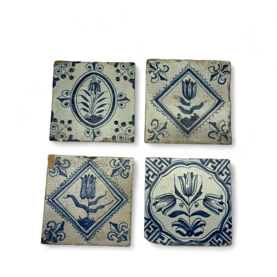 Lot van vier 17e eeuwse tegels, blauw-wit decor van bloemen, onder andere tulpen met Wanli hoekmotief en postzegelrand met Franse Lelie hoekmotief