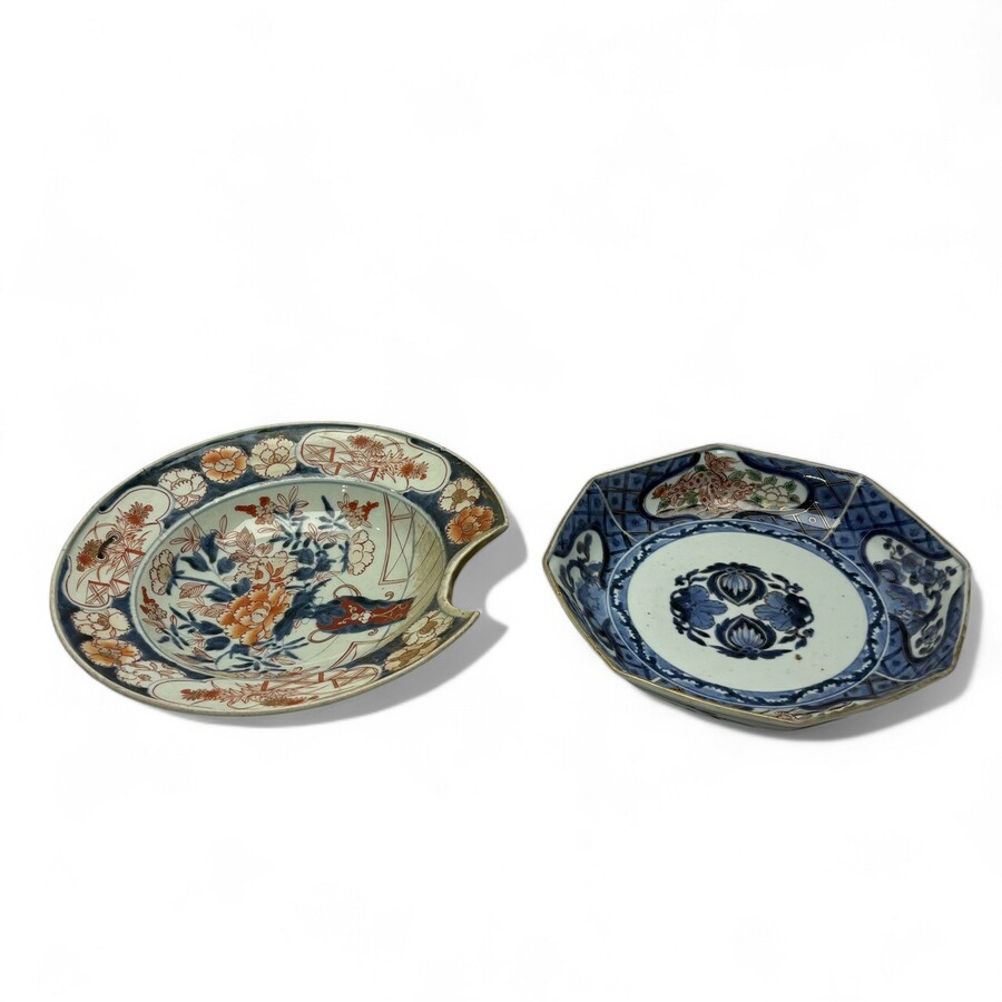Lot: een antieke 18e eeuwse Japans imari scheerbekken, met centraal decor van bloemen in een vas. Met daarbij een Japanse 18e/19e eeuwse achtkantige schotel, gemerkt met zeskaraktermerk.