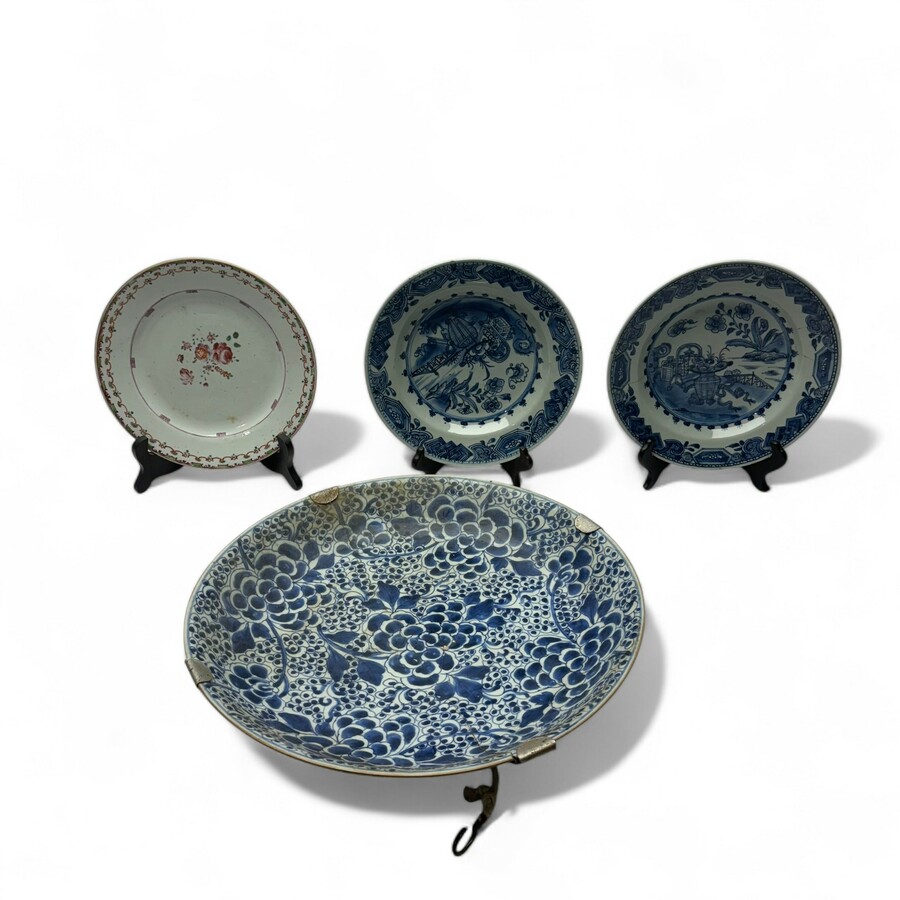 Lot 18e eeuws Chinees porselein: een 18e eeuwse Famille Rose schotel, twee 18e eeuwse blauw-witte Qianlong borden en een grote 18e eeuwse Kangxi schotel