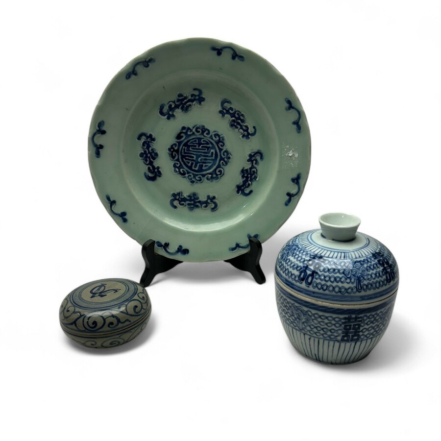 Lot van drie stuks Oosters porselein. Bestaande uit een Chinese deskelpot, een Vietnamese celadon schotel en een zalfpot met VOC wapen, naar antiek voorbeeld. 19e en 20e eeuws.