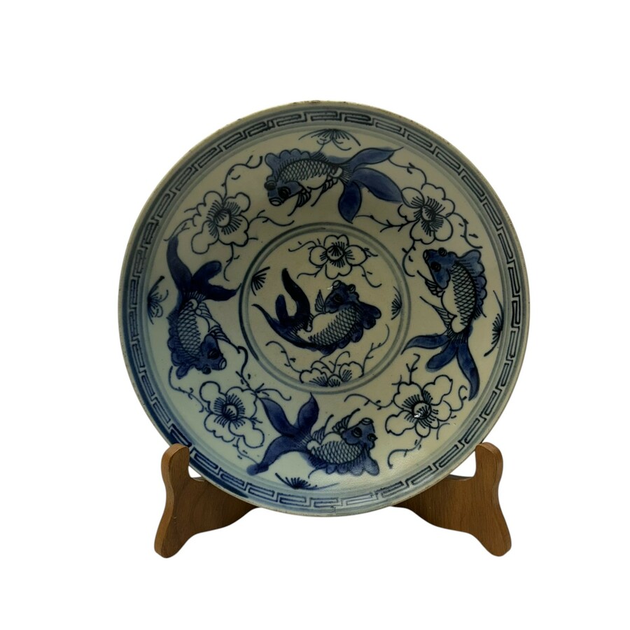 Een antiek 19e eeuws Chinees porseleinen bord met onderglazuur blauw-wit decor van vier vissen op de rand en één op het plat, omring door bloemen, met meanderrand. Aan de achterzijde gemerkt.