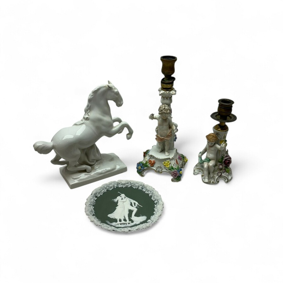 Lot divers porselein, waaronder een wit porseleinen paard en een lampje, gemerkt Dresden