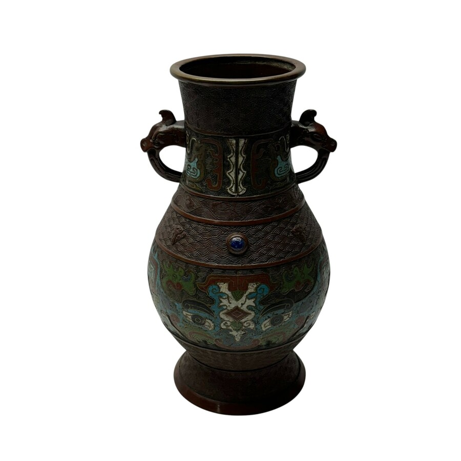 Een antieke laat 19e of vroeg 20e eeuwse Chinees bronzen champleve tweeorenvaas, aan de onderzijde gemerkt met vierkaraktermerk.