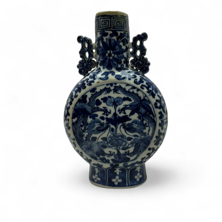 Een antieke 19e eeuwse Chinees porseleinen vaas/pelgrimsfles, met onderglazuur blauw-wit decor en centraal een decor met een draak.