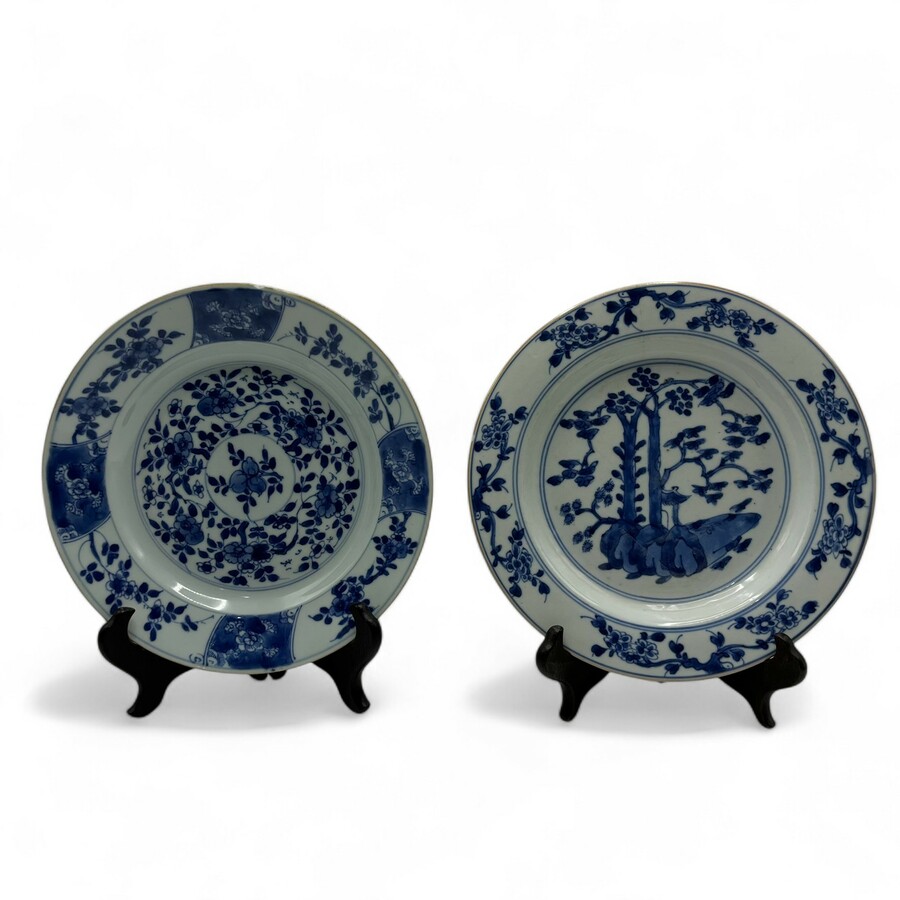 Twee 18e eeuwse Chinees porseleinen borden, blauw-wit decor van bloemen en één met rotsen, bomen en tempel.
