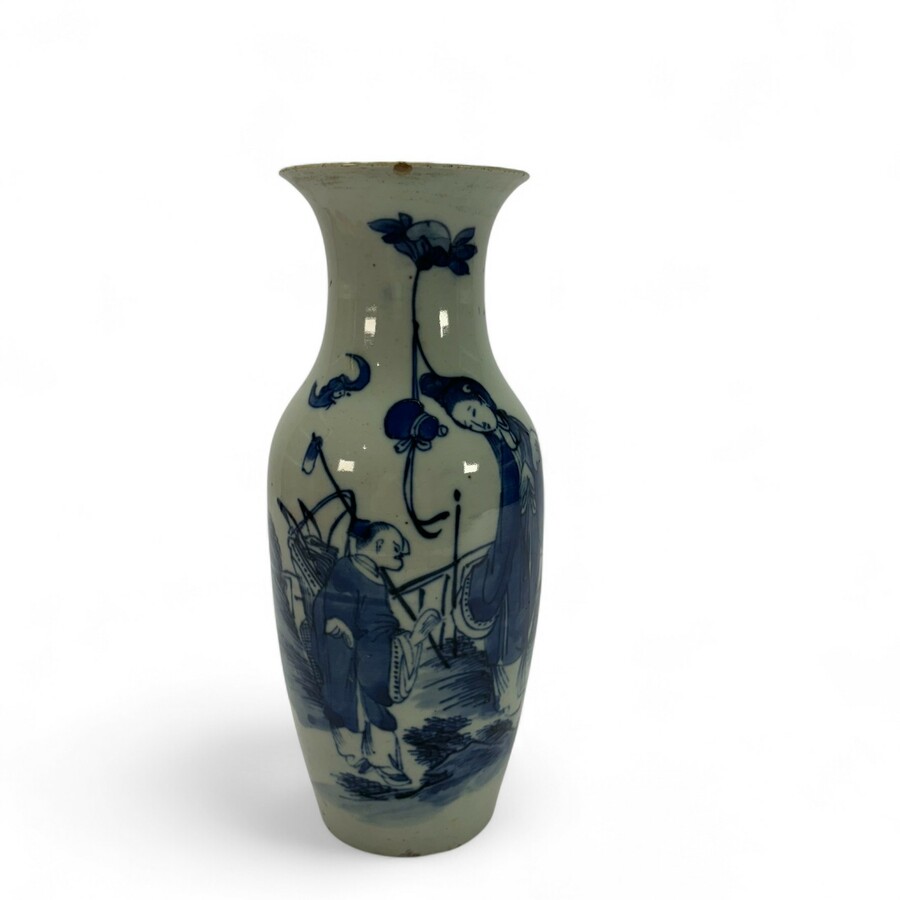 Een 19e eeuwse Chinees porseleinen vaas, 29 cm hoog. Blauw/wit met een decor van een lijs, zotje en vleermuis. Chip op de rand