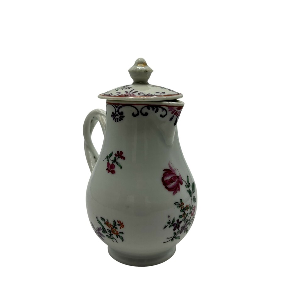 Chinees Qianlong periode porseleinen Famille rose melkkan met originele deksel met gevlochten oor. Met een floraal decor rondom. Voor de Europese markt gemaakt, zgn Chine de Commande.