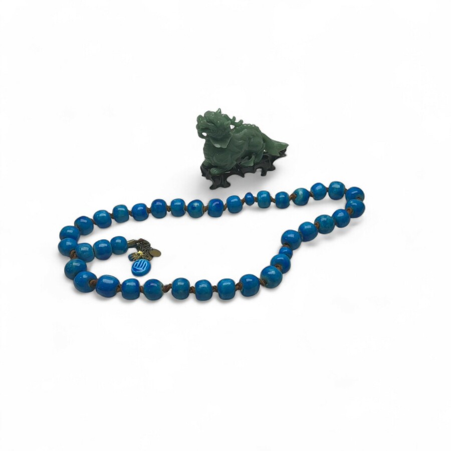 Een groenglazen Chinese draak op sokkel en een Oosters aardewerken kralencollier aan lederen koord