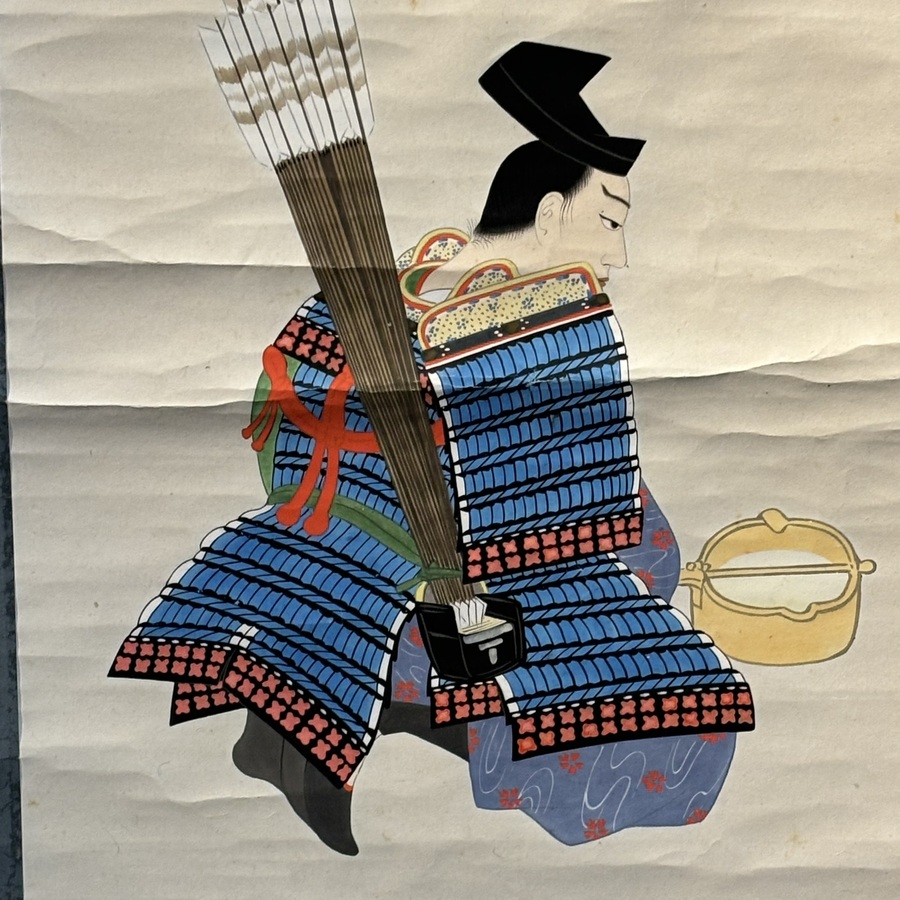 Paar Aziatische scrolls met kleurrijke voorstellingen: samoerai uitgerust met zwaard en pijl-en-boog, en samoerai op de rug gezien, zittend naast -wat lijkt op- een emmer melk, beide gouache op ...